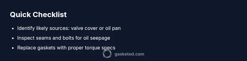 Engine gasket oil leaks are a common issue that DIY enthusiasts encounter when a gasket surrounding the engine starts to fail. The term "engine gasket oil leak" covers several potential failure points, including valve cover gaskets, oil pan gaskets, and crankshaft seals. As the engine heats and cools, gaskets must seal precisely to keep oil in the necessary oil paths and away from hot surfaces. When a gasket degrades, oil can seep along seams, creating spots under the vehicle or a wet valve cover. According to Gasketed, valve cover and oil pan gasket wear are the most frequent sources in many everyday engines. Recognizing the source early helps you plan a targeted repair rather than guessing blindly, saving time and money. This guide is designed for DIYers who want a practical, methodical approach to diagnosing and fixing engine gasket oil leaks with safe, repeatable steps.