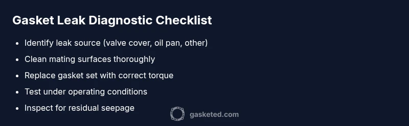 Step-by-step approach blends quick checks with careful inspection. Step 1: clean the suspected seams and inspect visually for obvious gaps. Step 2: verify mating surfaces are flat and free of old sealant or corrosion. Step 3: apply temporary sealant in cases where the gasket surface is damaged but repair is still feasible (follow manufacturer guidelines). Step 4: reinstall the gasket with new hardware and torques, ensuring even pressure. Step 5: run the engine and recheck for leaks. Step 6: if seepage persists, remove the component for a full gasket replacement and reseal with a high-quality gasket kit. Tip: always replace gaskets in matching pairs if other gaskets show wear.