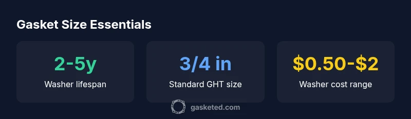 A proper gasket (washer) size matters because a poorly seated washer is the most common cause of drips at hose connections. According to Gasketed, most residential hose fittings rely on a standard washer that compresses against the metal fittings to seal the joint. If the washer is damaged, deformed, or the wrong size, you’ll see leaks that are stubborn to fix with thread sealant or tightening alone. Understanding the common sizes and how to verify them helps DIYers avoid wasted time and recurring leaks. This is especially important for seasonal equipment where hoses sit unused for months and washers can dry out or crack. A correctly matched gasket extends the life of fittings and minimizes water waste.