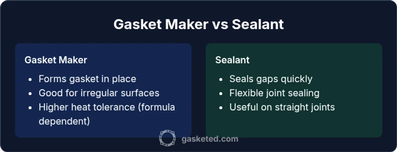 Gasket maker is a moldable silicone that cures to form a gasket in place. Sealant is a flexible liquid used to seal gaps and joints but may not create a full gasket profile. Use gasket maker for irregular surfaces or engine-like assemblies; use sealant for quick seals and straight joints.