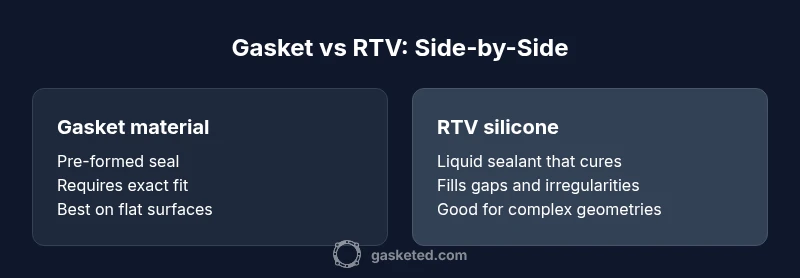 In DIY sealing projects, the choice between using a gasket and RTV sealant hinges on physical form, cure behavior, and maintenance expectations. According to Gasketed, the core difference is that gasket materials provide a pre-formed seal that compresses under clamping, while RTV is a liquid that cures to form a flexible bond that can fill minor surface imperfections. Understanding these fundamentals helps you forecast performance under vibration, thermal cycling, and chemical exposure. This knowledge translates to real-world outcomes, guiding you to map your task to the right approach without over- or under-sealing. Throughout, prioritize substrate compatibility and service conditions to avoid premature leaks. As you plan, document your joint geometry and available tooling—these factors often determine whether a gasket or RTV is the better fit for the job at hand.