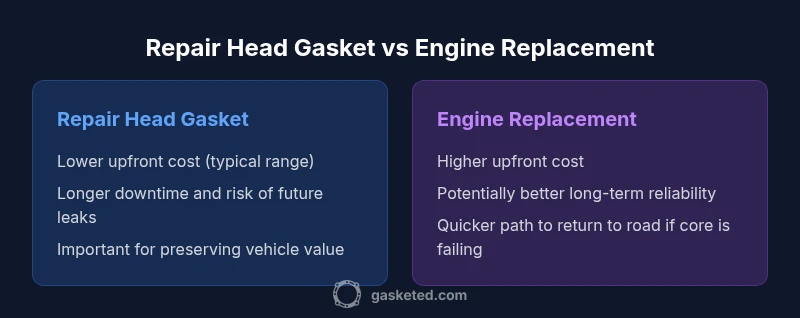 If the vehicle has solid value and limited core damage, gasket repair can be a sensible choice. For older, high-mileage engines or extensive damage, replacement reduces risk and may offer better long-term reliability.