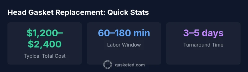 On average, the total cost to replace head gasket falls in the mid-to-high range for most cars, typically between $1,200 and $2,400. Real-world prices vary by engine design, labor rates, and whether related components are replaced. Most shops price the job as a parts-plus-labor combined estimate, so a detailed quote with a breakdown is essential for budgeting.