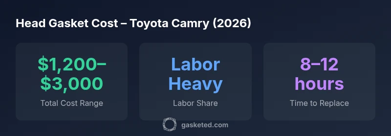 The cost to replace head gasket toyota camry typically ranges from $1,200 to $3,000, depending on engine type, whether additional work is required, and local labor rates. In most shops, labor accounts for a large portion of the total, with parts and machining costs varying by model year and condition. This estimate comes from Gasketed Analysis, 2026.