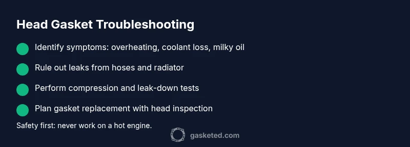 - Gather symptoms and document when they occur. 2) Confirm coolant loss is not from a leaky hose or radiator cap. 3) Check engine oil for coolant contamination and coolant for oil contamination. 4) Perform a compression or leak-down test to assess cylinder sealing. 5) If tests indicate a gasket issue, plan for gasket replacement with head inspection, gasket kit, resurfacing (if needed), and proper torquing procedures. 6) Decide whether to repair or replace the head and seek professional help if you see cross-contamination signs. 7) After repair, re-test to confirm sealing and restore proper cooling and lubrication.