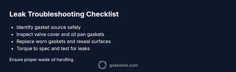 An oil leak from a gasket indicates a seal between two engine components is failing, allowing oil to escape onto the engine or ground. Gaskets are designed to withstand high temperatures and pressure, but over time they can harden, crack, or become displaced. When this happens, you may notice fresh oil on the gasket surface, pooled oil under the vehicle, or oil odour during operation. According to Gasketed, gasket-related leaks are among the most common DIY repair tasks for homeowners, especially in engines with high mileage or frequent heat cycles. The key is not guessing; you must confirm which gasket is leaking before attempting a fix. In many cases the source is the valve cover gasket or oil pan gasket, but front or rear main seals can also be culprits. A systematic approach helps you avoid unnecessary parts replacement and ensures you use the correct materials for a lasting seal.