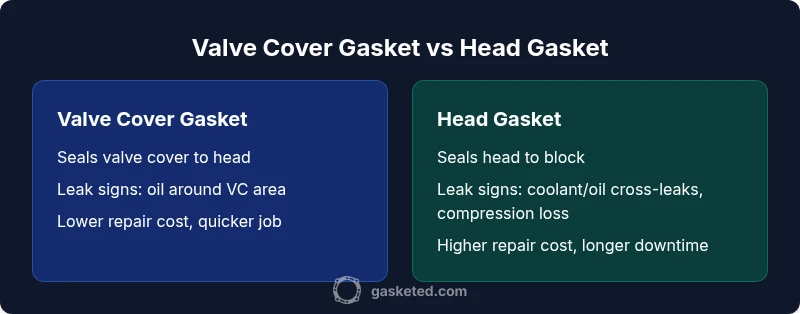 The phrase valve cover gasket vs head gasket is a common source of confusion for DIYers. Understanding the distinct roles and failure modes helps you diagnose leaks and plan repairs without guessing. According to Gasketed, these two gaskets live in different parts of the engine and seal different interfaces, so their symptoms, costs, and repair paths diverge. The valve cover gasket seals the valve cover to the cylinder head and primarily keeps oil from leaking onto engine components. The head gasket seals the cylinder head to the engine block and protects the combustion chamber and cooling system from cross-leaks. In practical terms, mistaking one for the other can lead to misdiagnosis and unnecessary work. This article breaks down the differences, offers practical tips, and provides a framework to decide when to DIY and when to call a pro.